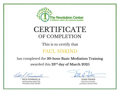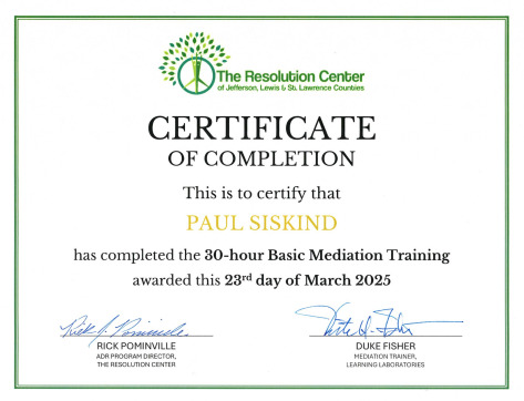 I am certified as a Mediator for the Resolution Center of Jefferson, Lewis, and St. Lawrence Counties, through whom I provide Alternative Dispute Resolution for the NY State Unified Court System. My mediation work includes child custody/visitation, landlord-tenant disputes, small claims, and community cases.