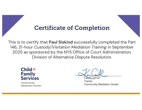 I am certified as a Mediator for the Resolution Center of Jefferson, Lewis, and St. Lawrence Counties, through whom I provide Alternative Dispute Resolution for the NY State Unified Court System. My mediation work includes child custody/visitation, landlord-tenant disputes, small claims, and community cases.